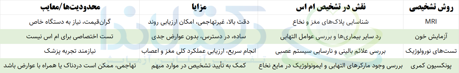 جدول مقایسه روشهای تشخیصی ام اس