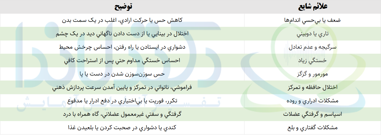جدول علائم شایع ام اس